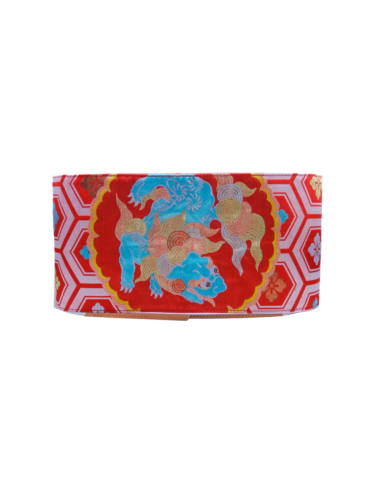 獅子柄刺繍が個性的でパンチの効いた逸品!アンティーク帯のリメイク帯ベルト(タッセルカラーは赤)