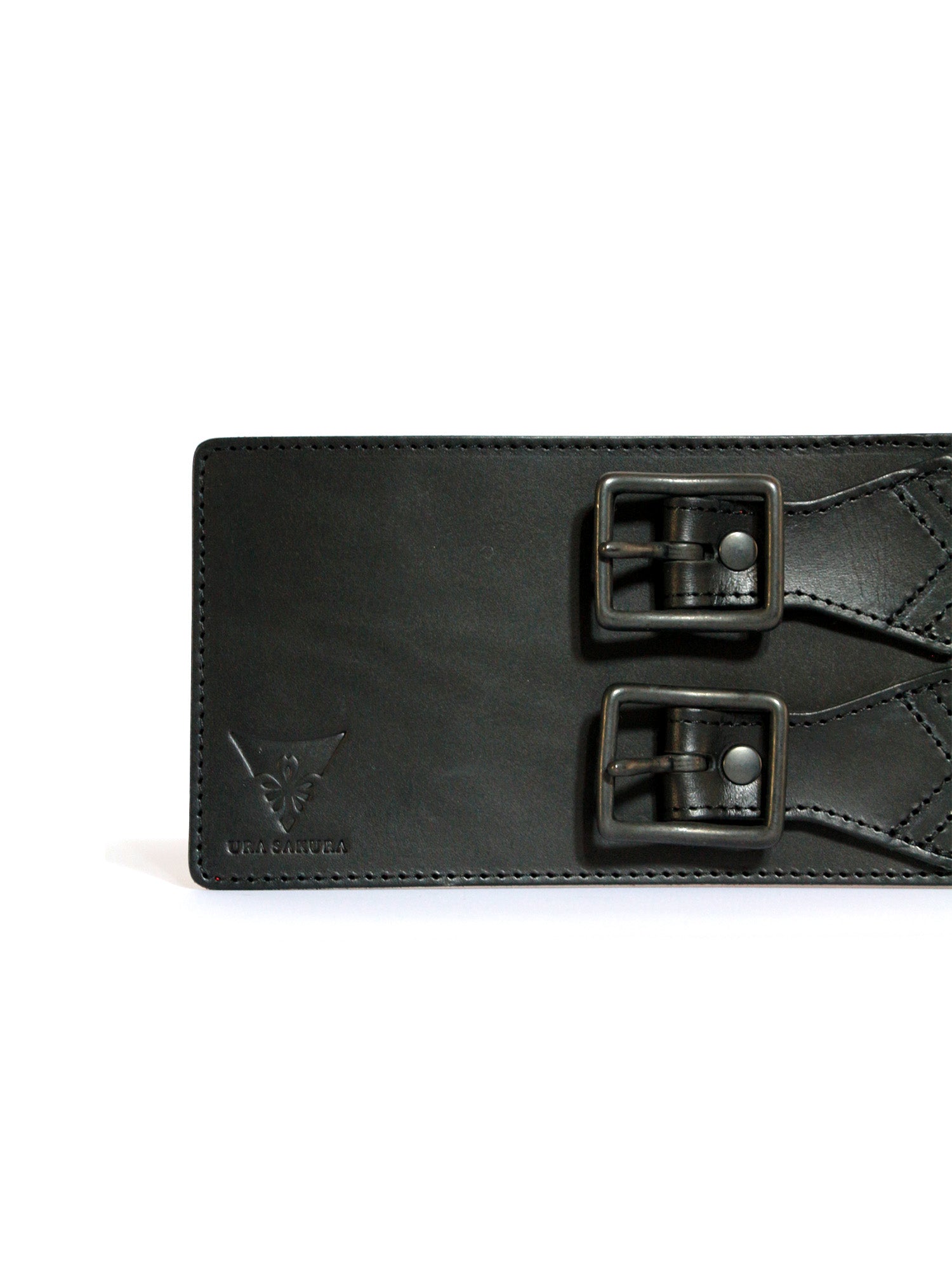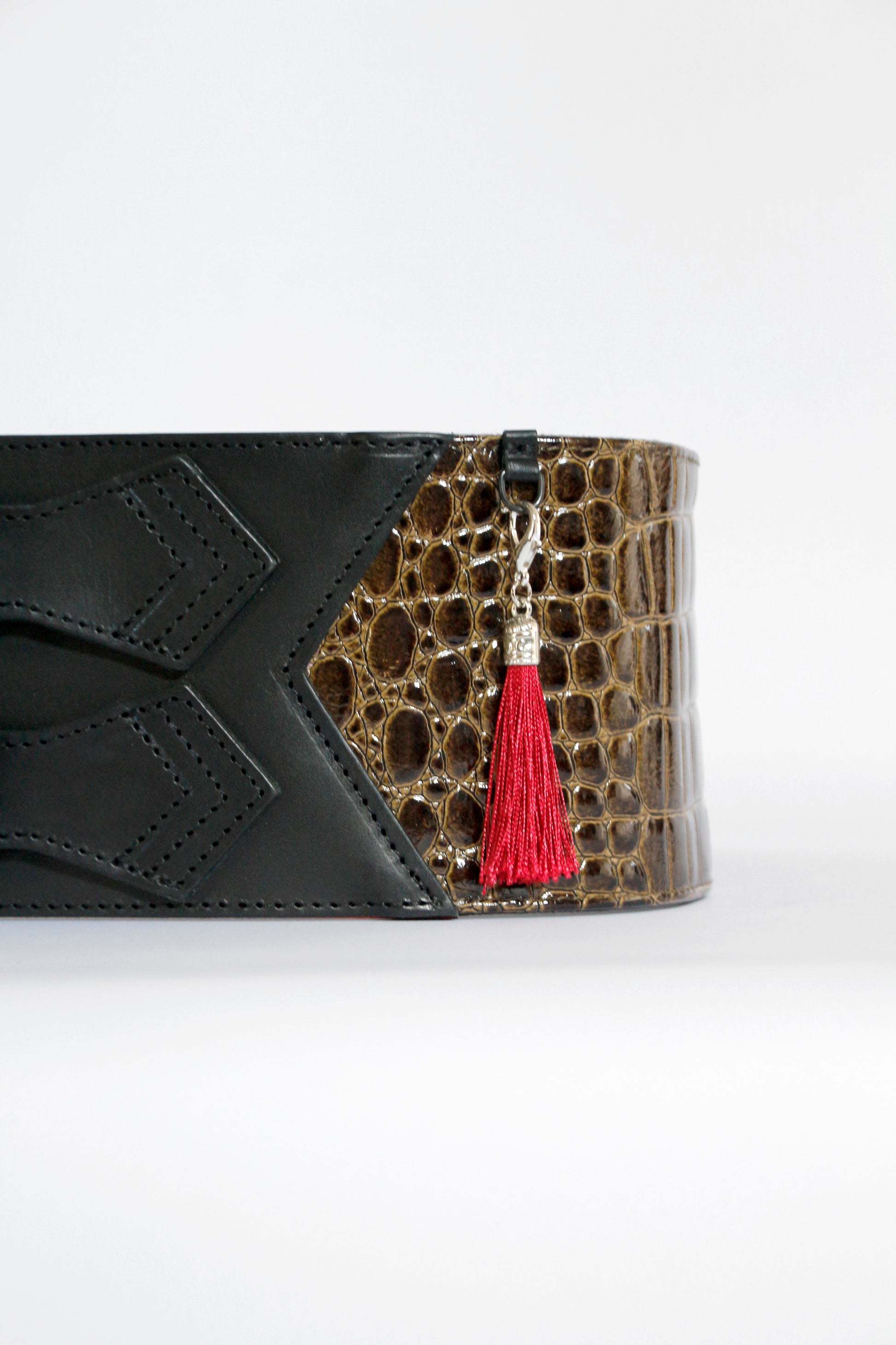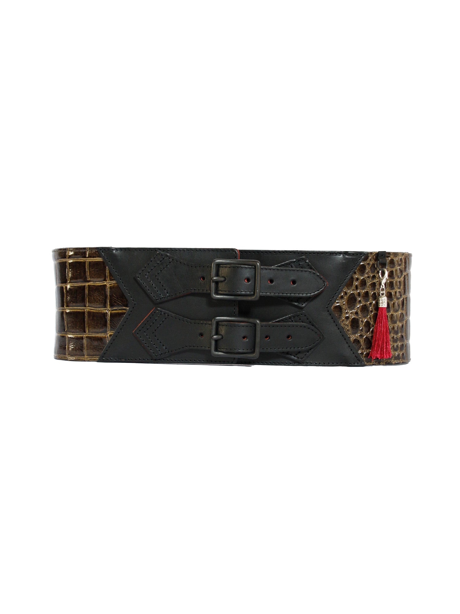 重厚なクロコ型押しエナメルレザー(本革)を贅沢に使用したコルセット帯ベルトは、光を受けて美しく輝く質感で、存在感を放ち、装いにラグジュアリーなアクセントを加えます。
