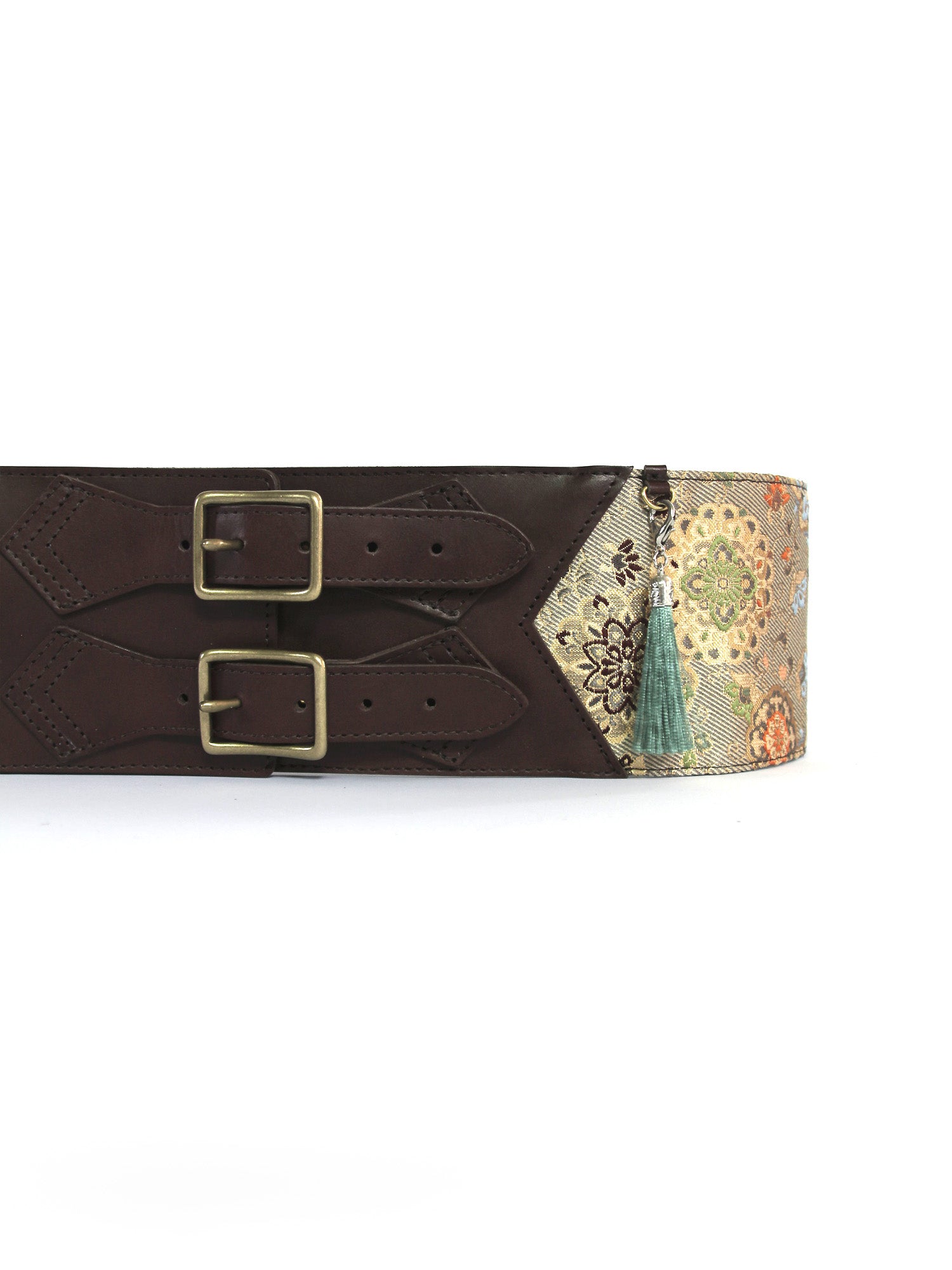 華紋と唐草が繊細に織り込まれた西陣織の金襴生地を贅沢に使用。レザーはシックなブラウンを採用し洗練された趣に。(タッセルカラーはグリーン)