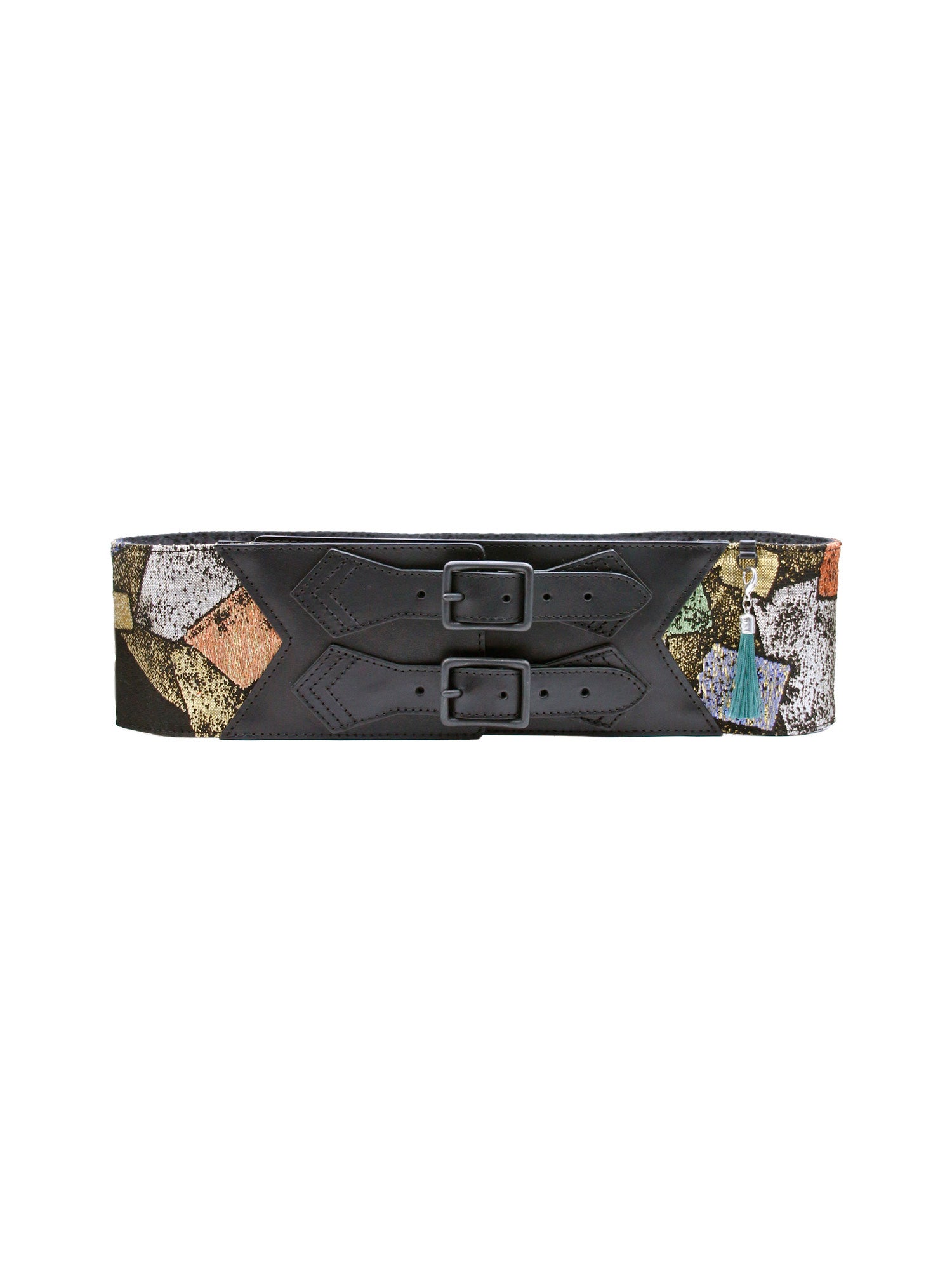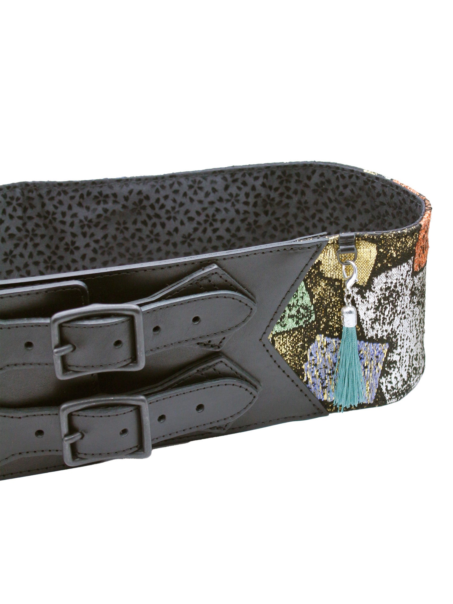 モダンなデザインが目を惹く、伝統ある龍村平織製帯のリメイク帯ベルト(タッセルカラーはグリーン)