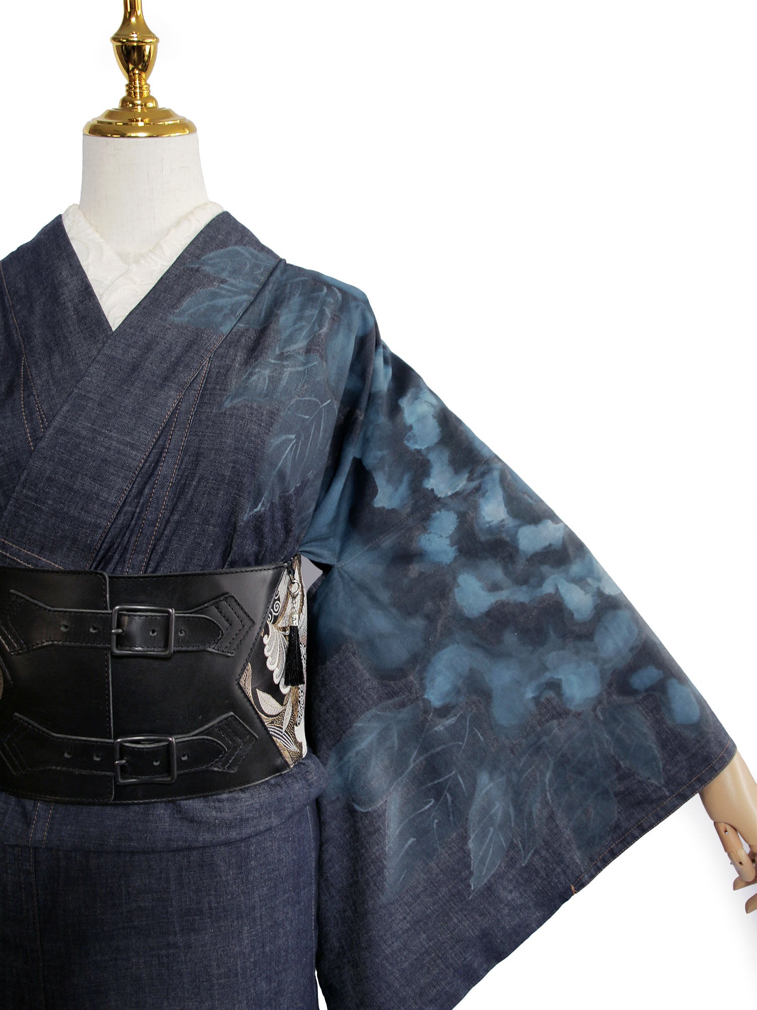 デニム着物は天然繊維のため、水分を含むと多少縮むことがあります。(0~約3cm前後)
